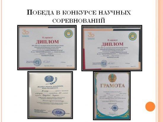Исследовательская работа в школе переживает новый этап своего развития и представляет собой одно из направлений модернизации образования. При этом чаще всего научно-исследовательская работа ведется по инициативе учителя. Именно учитель выступает как организатор и руководитель ученических исследований и, соответственно, несет ответственность за результаты работы. Осень 2021 года ознаменована особыми достижениями обучающихся 22 школы г.Тараз. Два вторых места заняли Климова Кристина (руководитель Ушакбаев Бауржан Болатбекович, секция «Информатика») и Оразбай Улдана (руководитель Шатаева Гульжан Баубековна, секция «Этнокультуроведение») на городском этапе республиканского конкурса научных проектов.