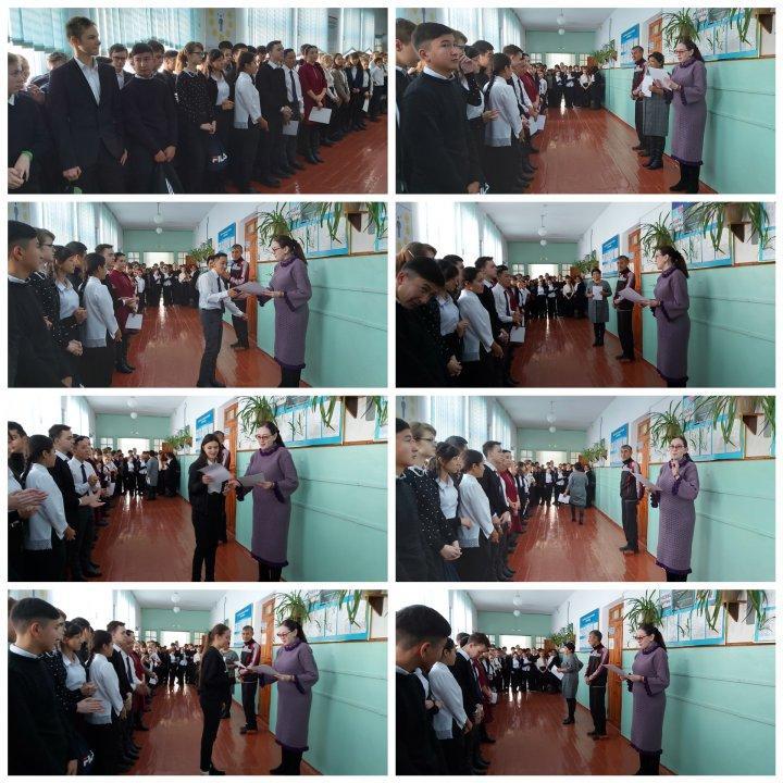 2019 жылдың 25 қарашасында сағат 10:10-да мектеп дәлізінде қараша айының қорытындысын шығару бойынша (мұғалімдер мен оқушылардың жетістіктері)туралы салтанатты линейка рәсімі өтті.
