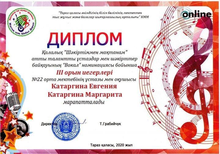 10 ноября в нашем прекрасном городе в здании КГУ «Центр внешкольной работы и детского творчества отдела образования акимата города Тараз» прошёл творческий онлайн - конкурс среди образовательных школ и городских центров дополнительного образования под названием «Шәкіртіммен мақтанам». От школы № 22 выступили ученица 4 «Б» класса Катаргина Маргарита в дуэте с педагогом – учителем музыки Катаргиной Евгенией Анатольевной. По итогам конкурса был отмечен высокий исполнительский уровень вокалистов и хорошие природные данные. Конкурсанты были дипломированы на 3е место по жанру вокала. Желаем и дальше покорять вершины творческого мастерства!