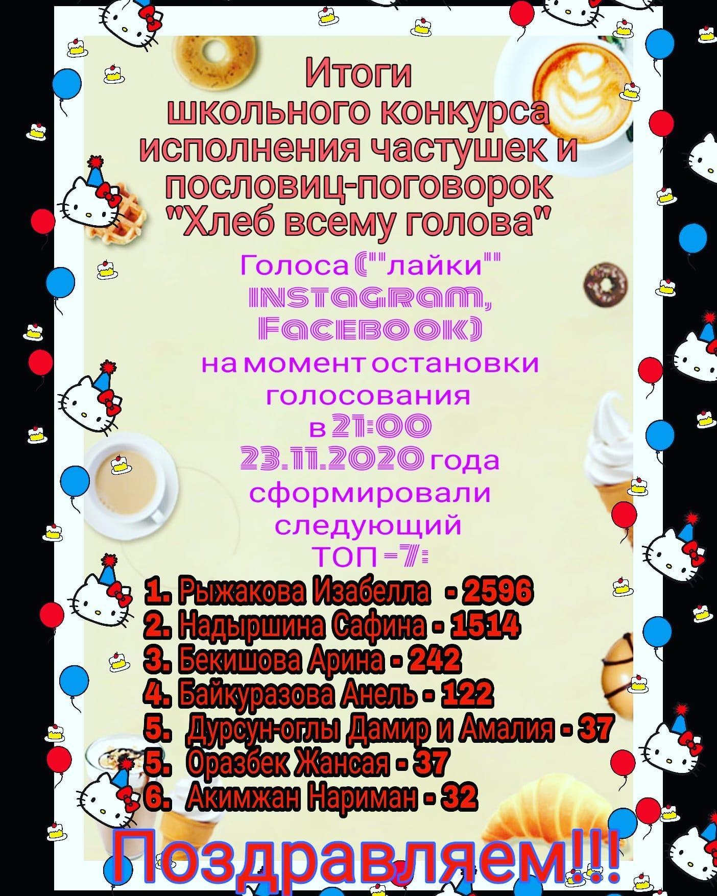 25 ноябрь 2020 0 1 2 3 4 5 Итоги конкурса исполнения частушек и пословиц-поговорок Итоги школьного конкурса исполнения частушек и пословиц-поговорок про еду "Хлеб всему голова". ПОЗДРАВЛЯЕМ!!! ТАКЖЕ БЛАГОДАРИМ НАШИХ ПОДПИСЧИКОВ И ВСЕХ ТЕХ, КТО ПОДДЕРЖАЛ НАШИХ САМЫХ МАЛЕНЬКИХ, ТАЛАНТЛИВЫХ И КРЕАТИВНЫХ УЧЕНИКОВ!