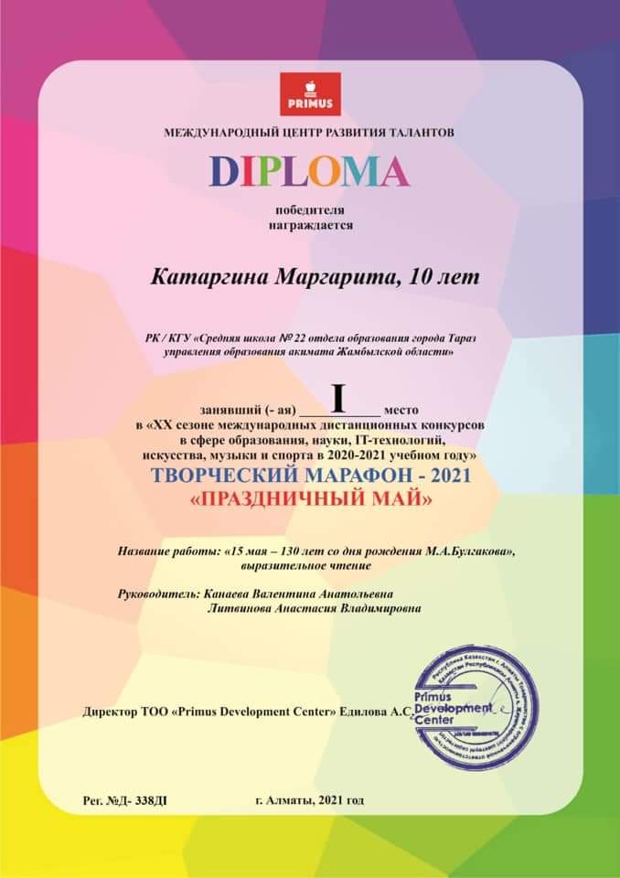 31 май 2021 0 1 2 3 4 5 Творческие достижения наших учащихся. Тараз қалалық №22 орта мектебінің 4 "Б" сынып оқушысы Катаргина Маргарита ұлтаралық қашықтықтан өткізілген шығармашылық байқауға қатысып, жүлделі орынға ие болды. Сынып жетекшісі: Канаева Валентина Анатольевна.