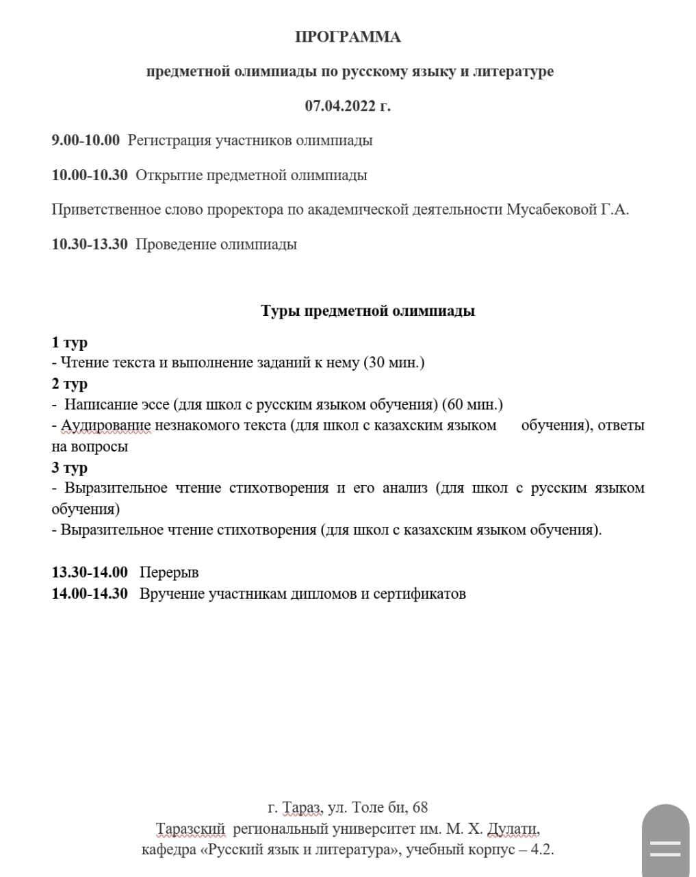 7 апреля 2022 г. кафедра «Русский язык и литература» Таразского регионального университета им.М.Х.Дулати провела очную олимпиаду среди обучающихся 10-11 классов гимназий и школ Жамбылской области. По итогам олимпиады ученицы СШ№22 Рапилбек Ақерке и Досмоилова Русалина стали обладателями дипломов 2 и 3 степеней. Поздравляем!