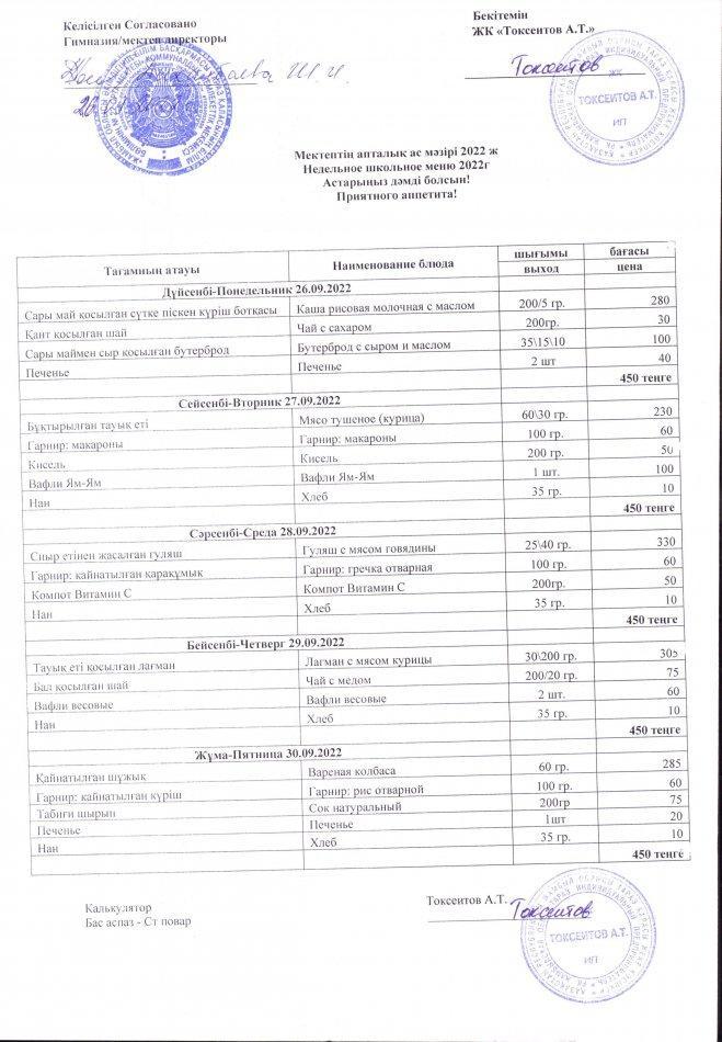 Меню с 26 по 30 сентября 2022 года » №22 орта мектеп
