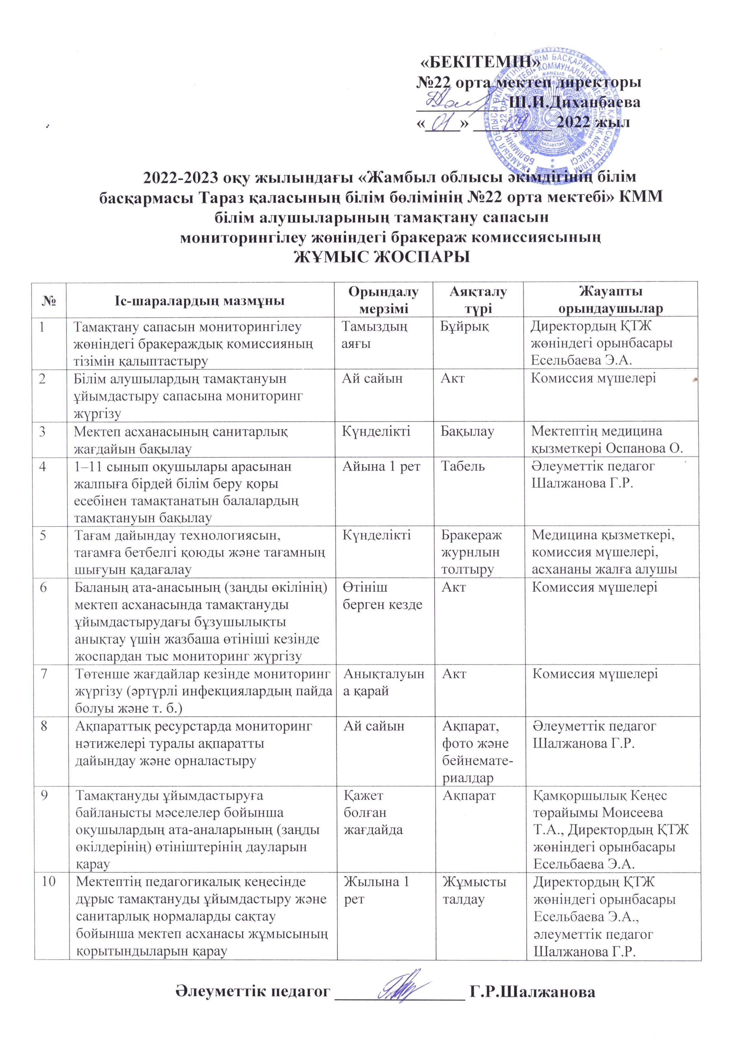 2022-2023 оқу жылындағы "Жамбыл облысы әкімдігінің білім басқармасы Тараз қаласының білім бөлімінің №22 орта мектебі" КММ білім алушыларының тамақтану сапасын мониторингілеу жөніндегі бракераж комиссиясының жұмыс жоспары » №22 орта мектеп