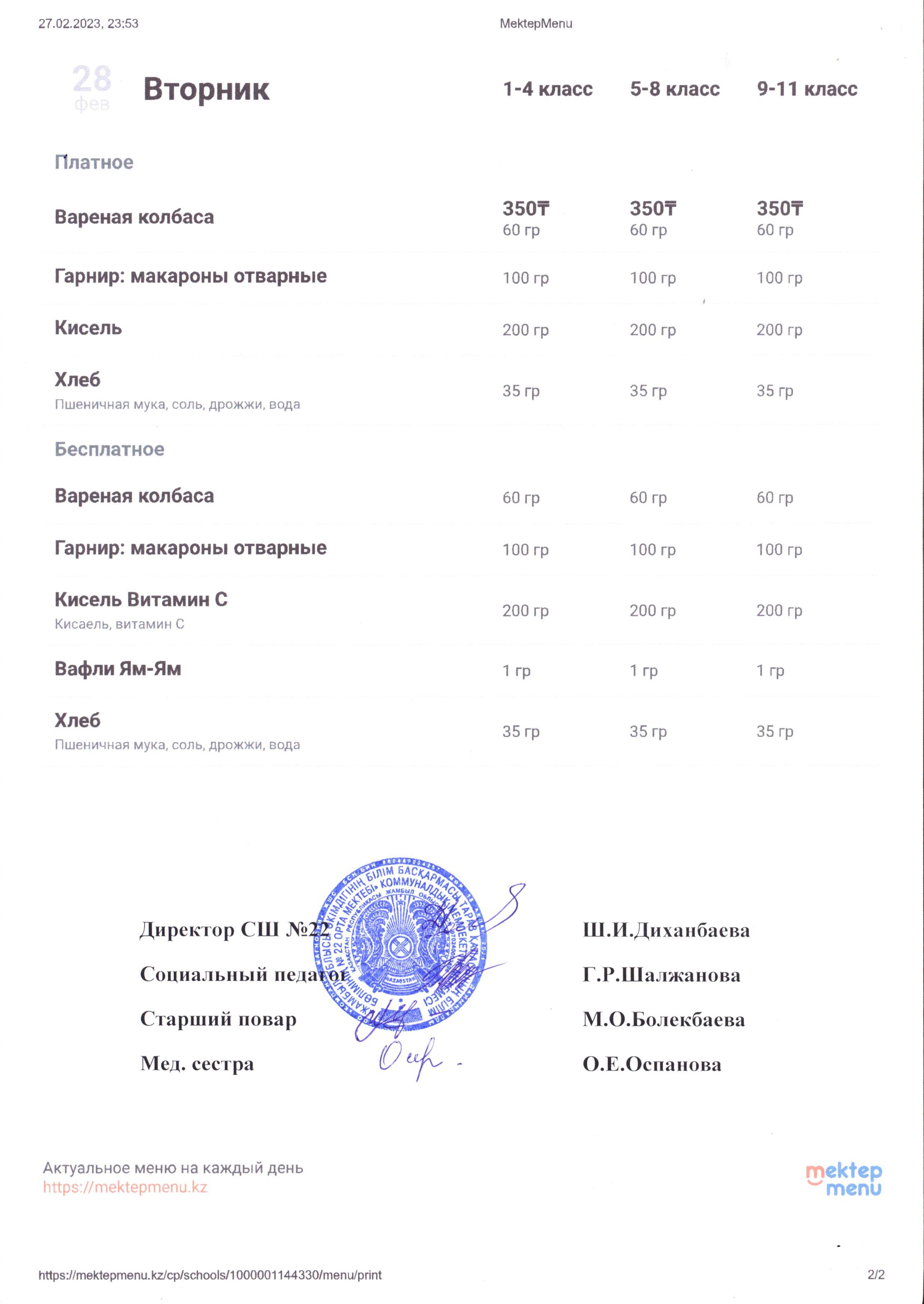 Меню на 28 февраля 2023 года » №22 орта мектеп