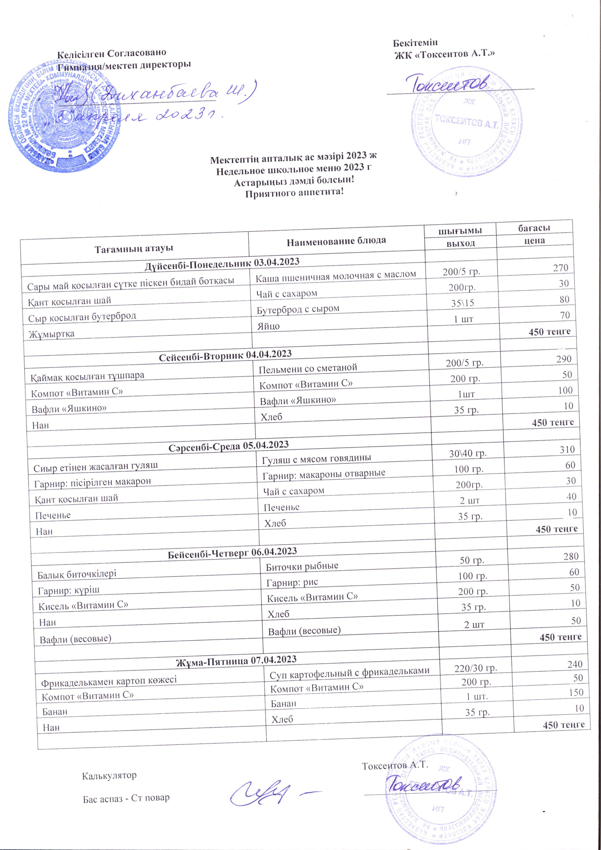 » » 2023 жылдың 3 сәуірі мен 7 сәуірі аралығындағы ас мәзірі