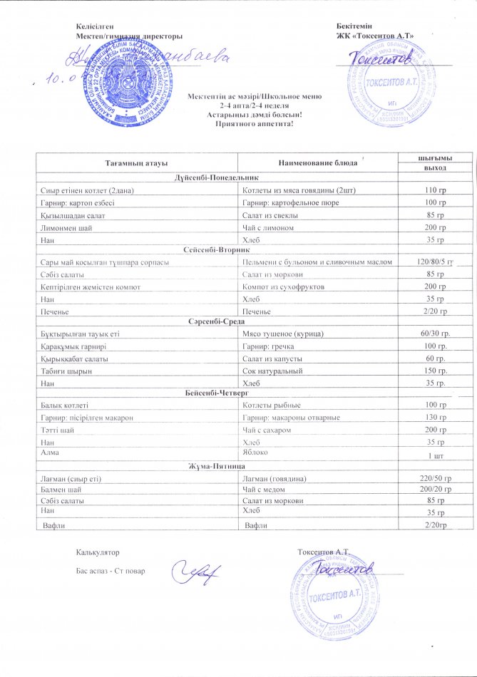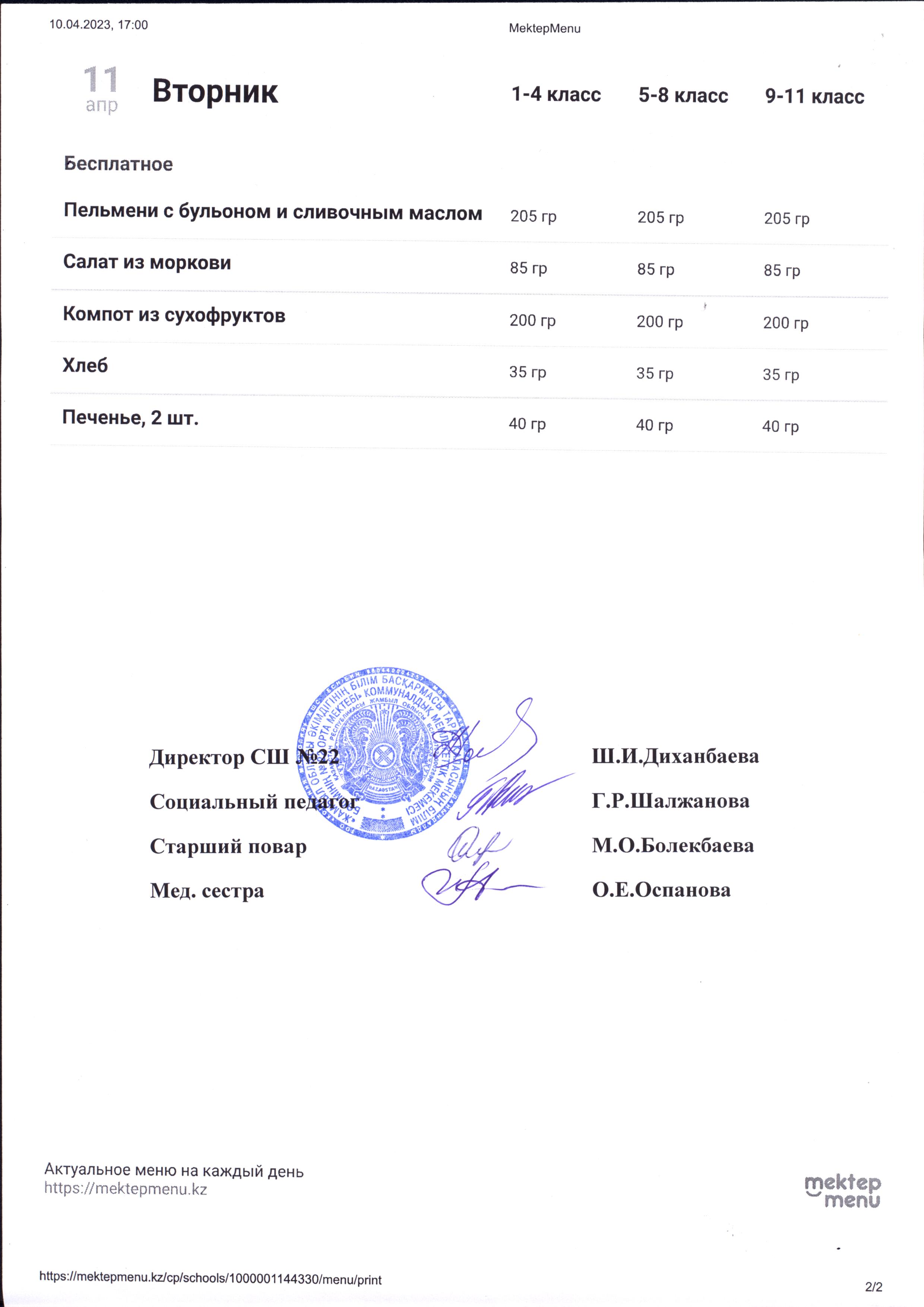 2023 жылдың 10 сәірінен 14 сәуіріне дейінгі ас мәзірі » №22 орта мектеп