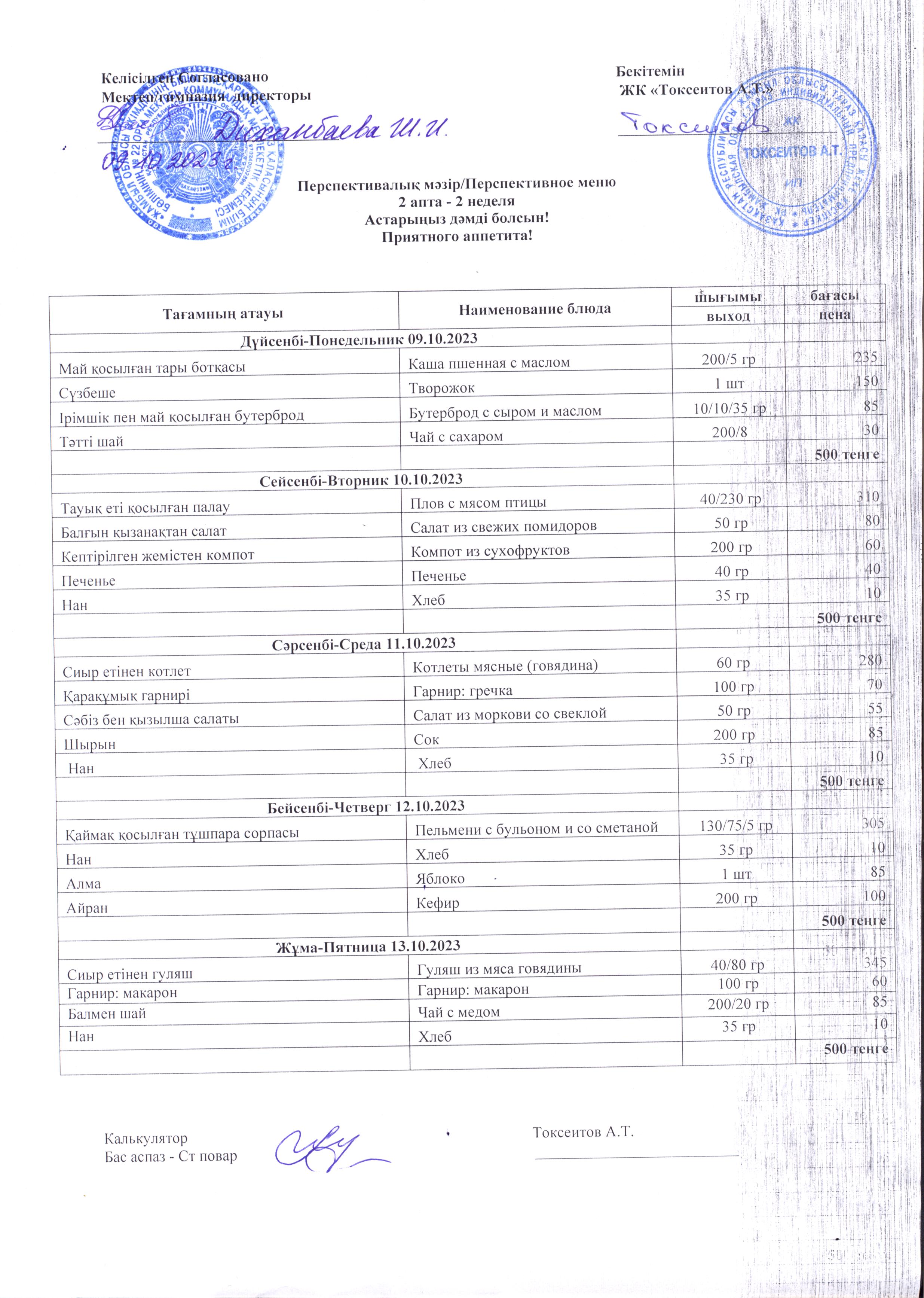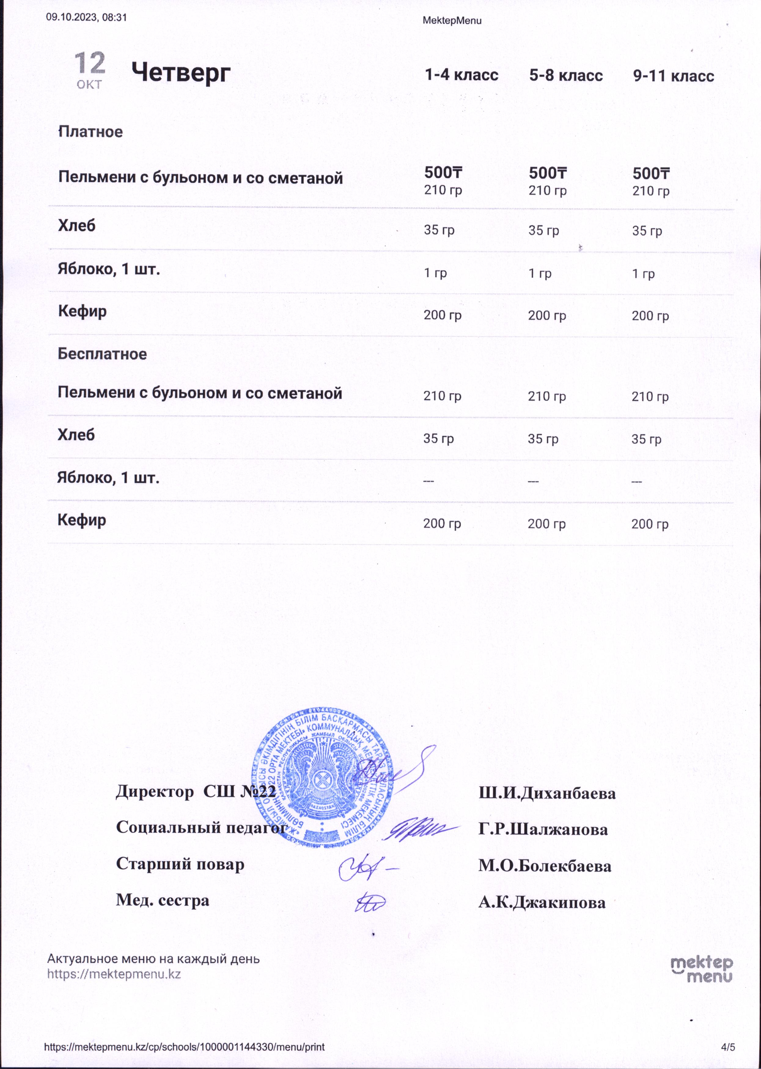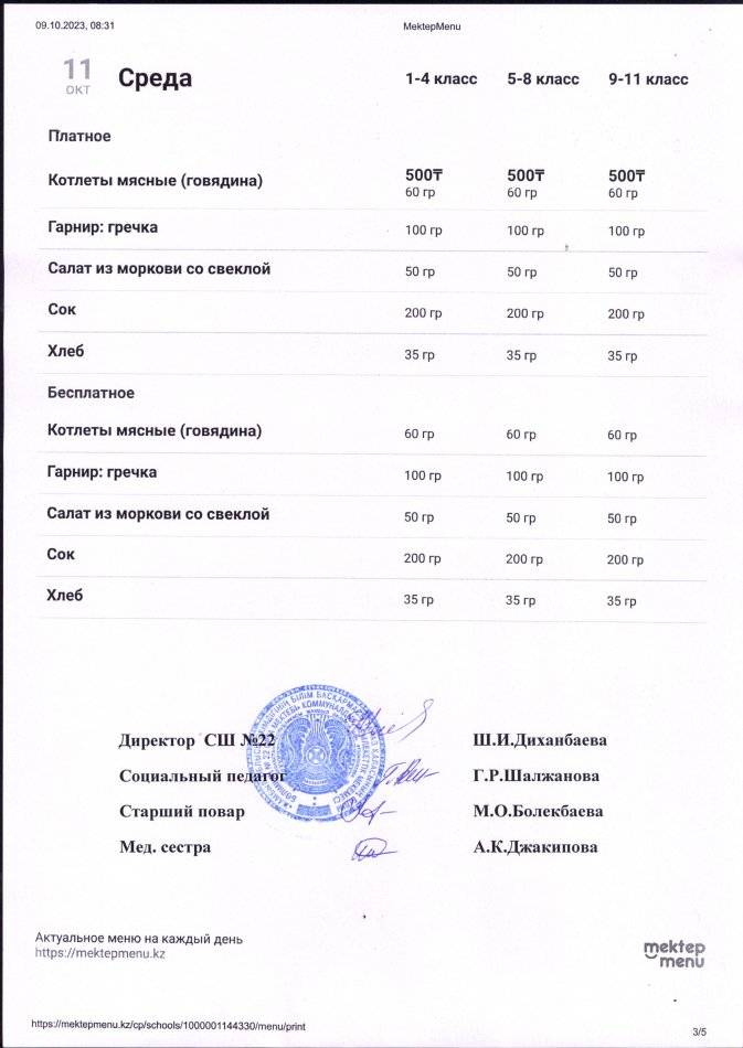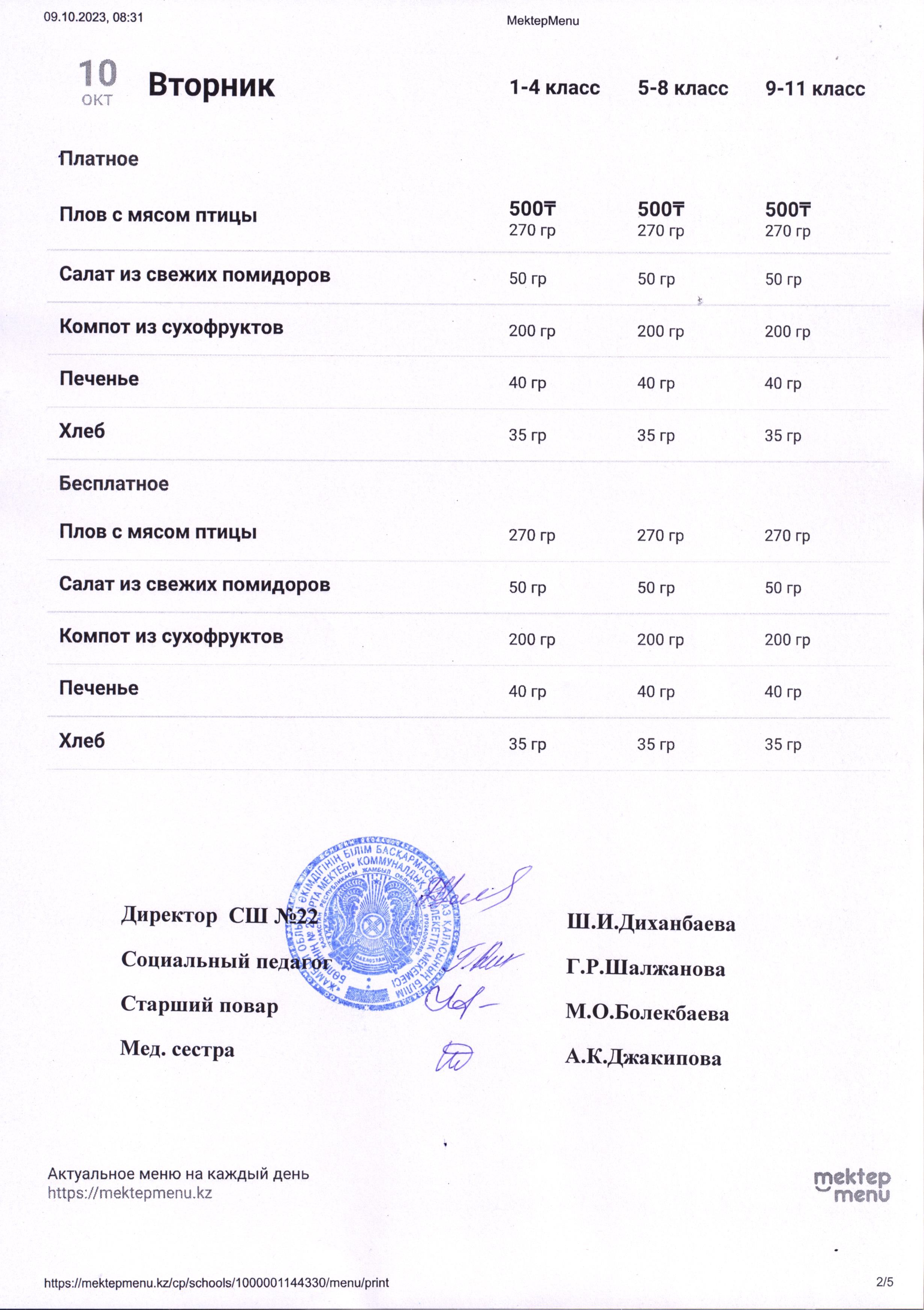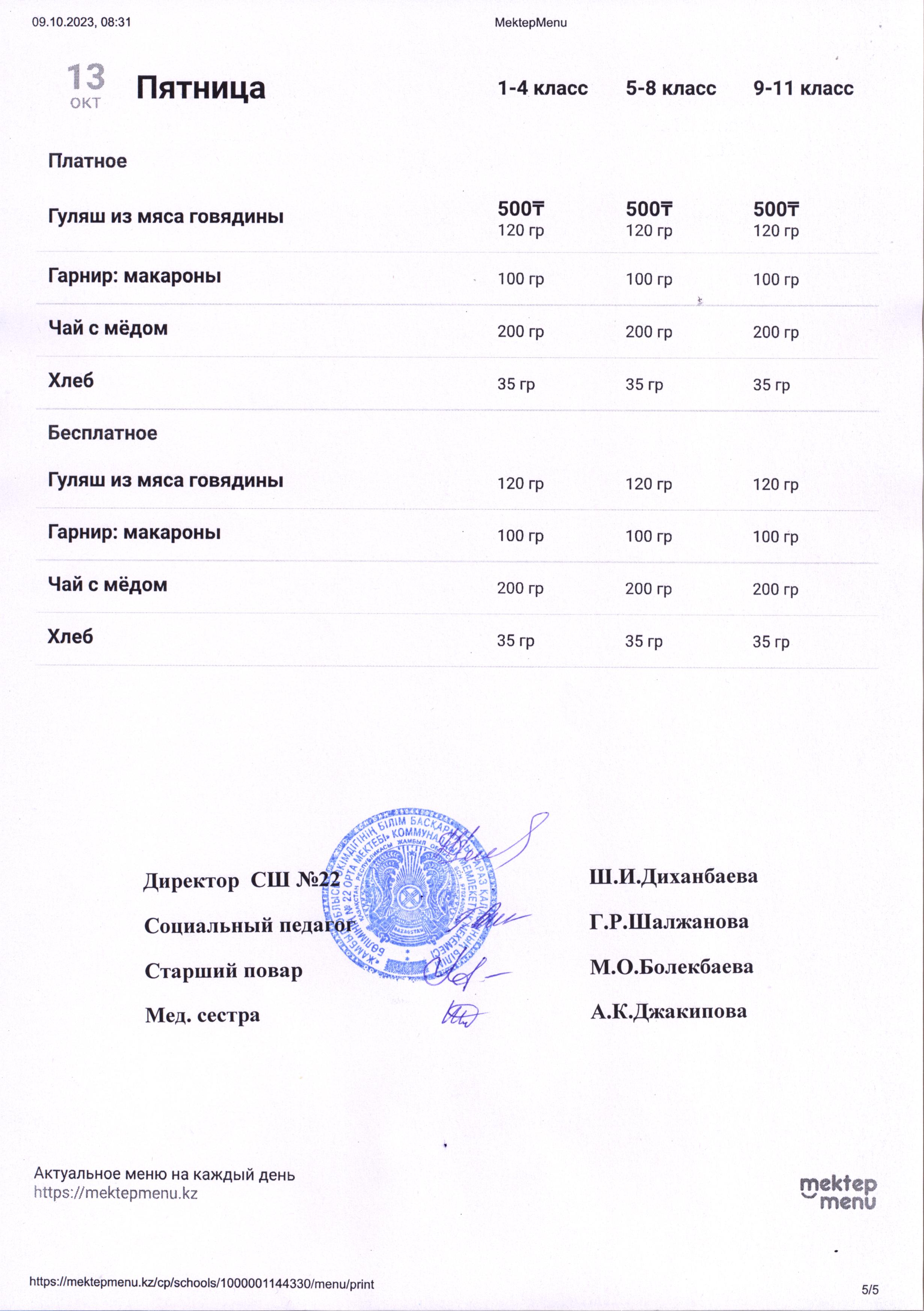 2023 жылдың 9 қазаны мен 13 қазаны аралығындағы тегін ыстық тамақтың апталық және күндік ас мәзірі. Недельное и ежедневное меню бесплатного питания с 9 по 13 октября 2023 года » №22 орта мектеп