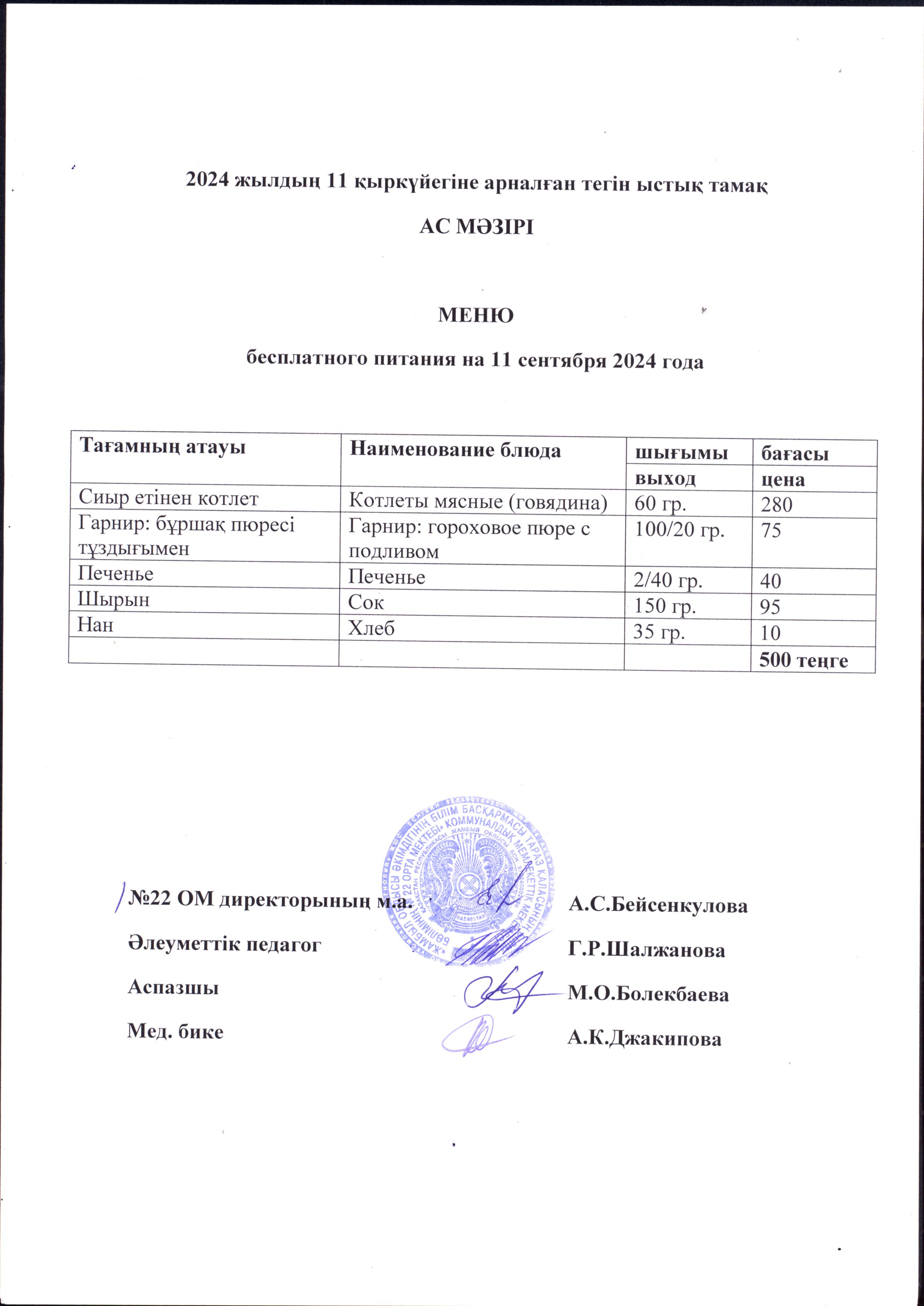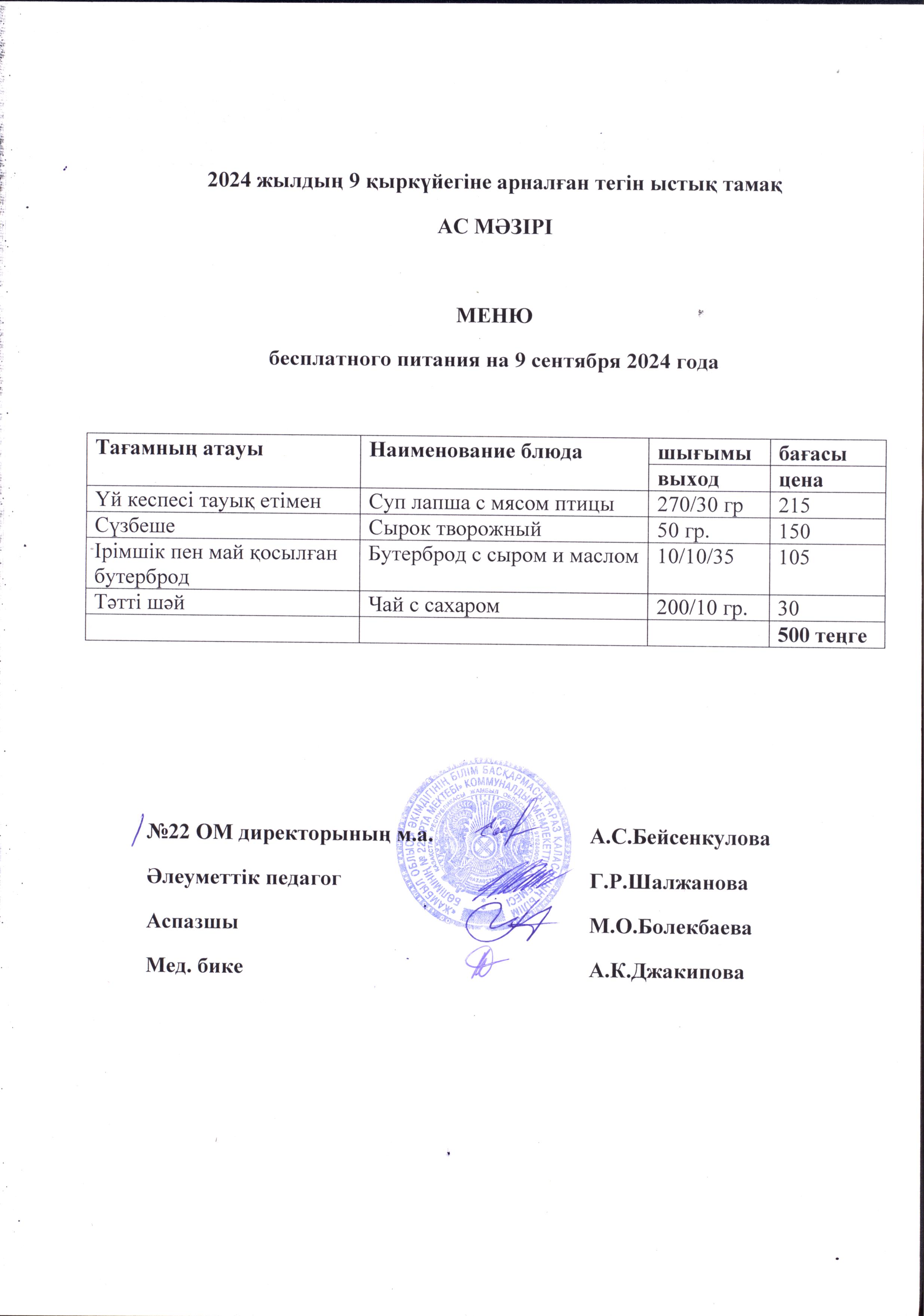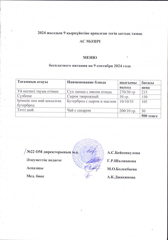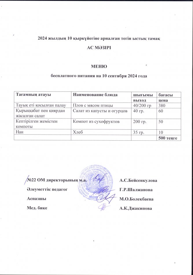 2024 жылдың 9 қыркүйегі мен 13 қыркүйегі аралығындағы апталық және күндік тегін тамақ мәзірі. Недельное и ежедневное меню бесплатного питания с 9 по 13 сентября 2024 года » №22 орта мектеп
