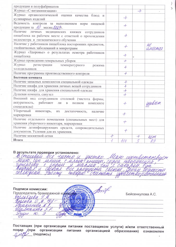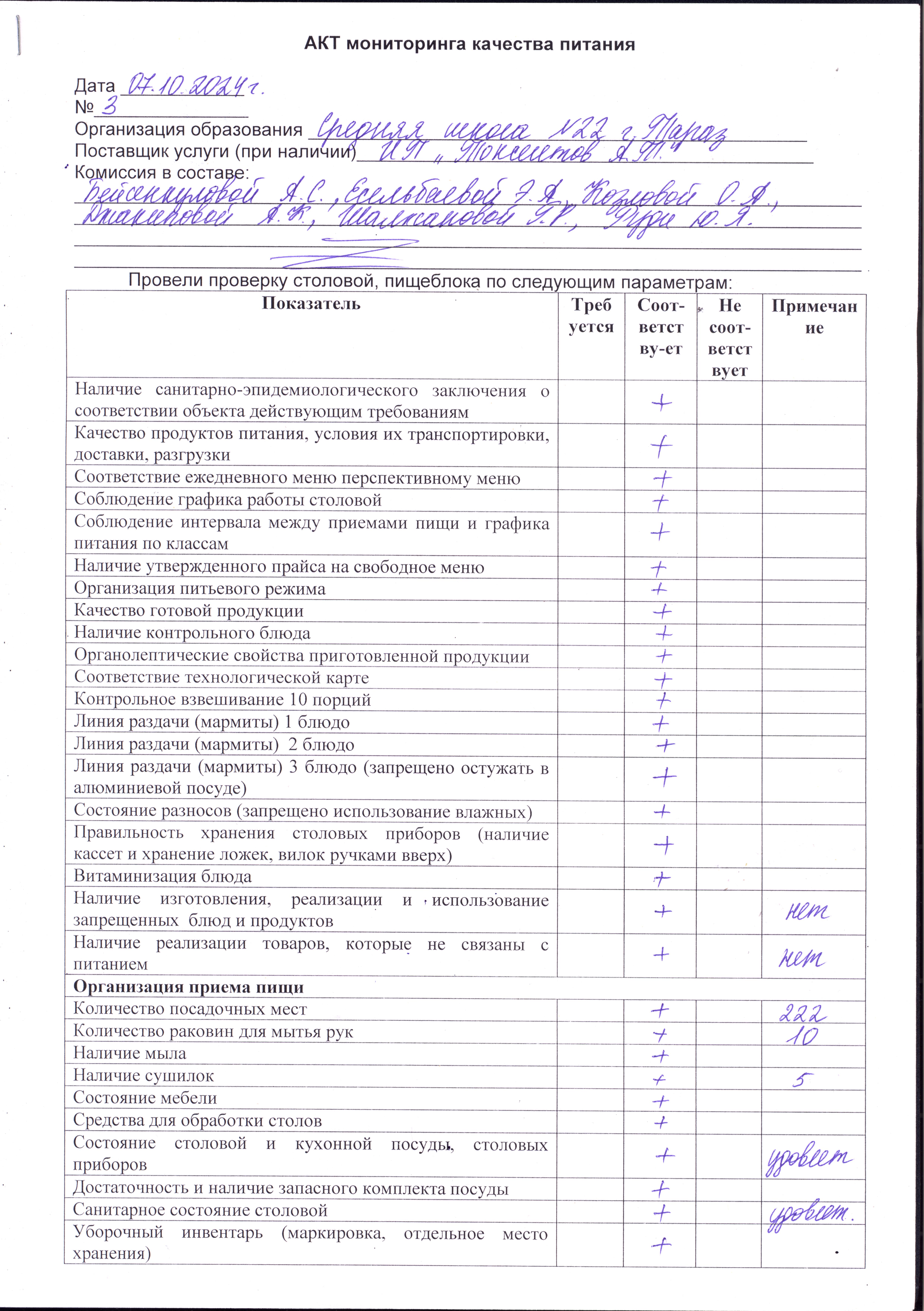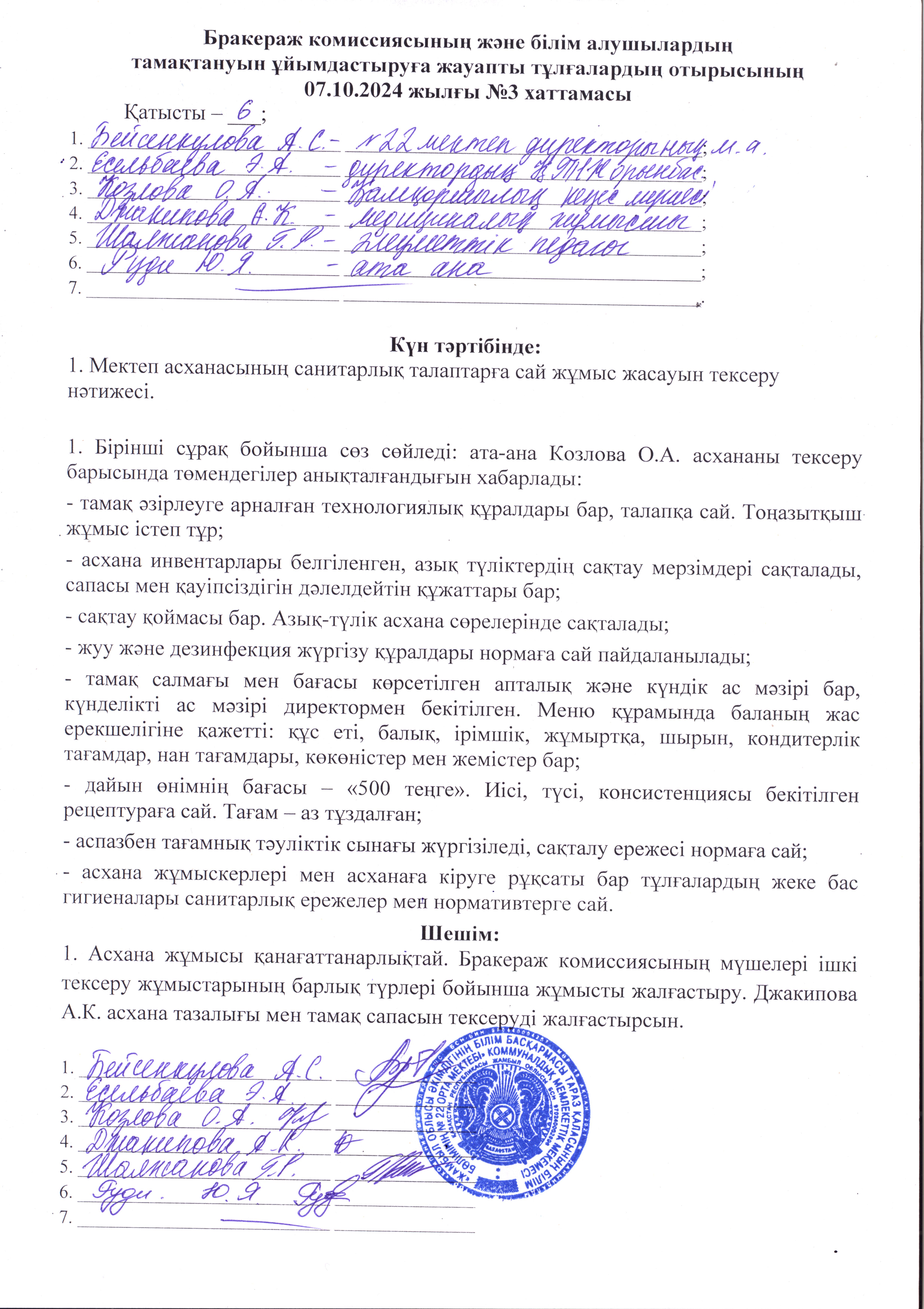 07 октябрь 2024 0 1 2 3 4 5 2024 жылдың 7 қазаны күнгі тамақтану сапасын мониторингілеу АКТ-сі мен бракераж комиссиясының отырысының хаттамасы