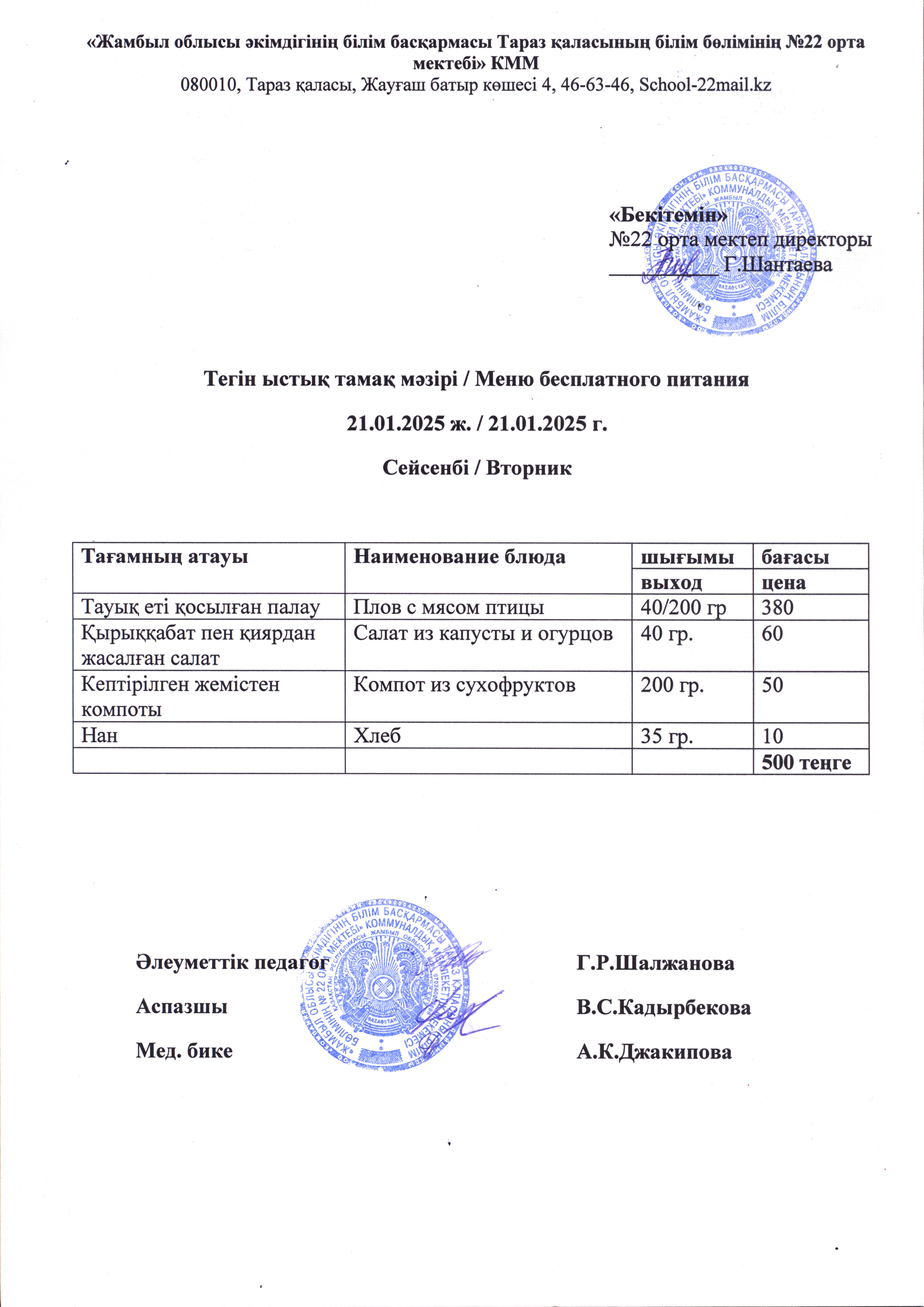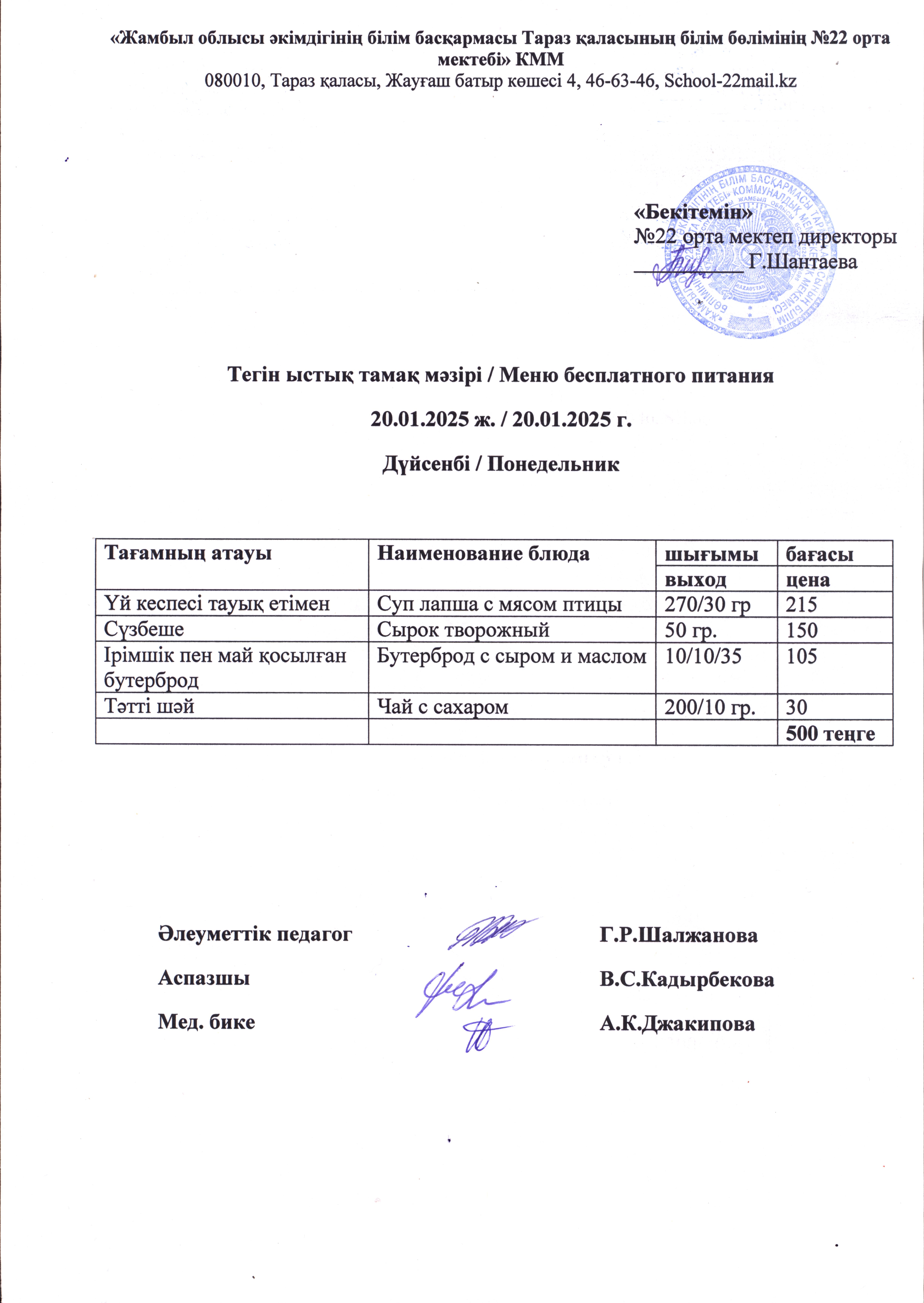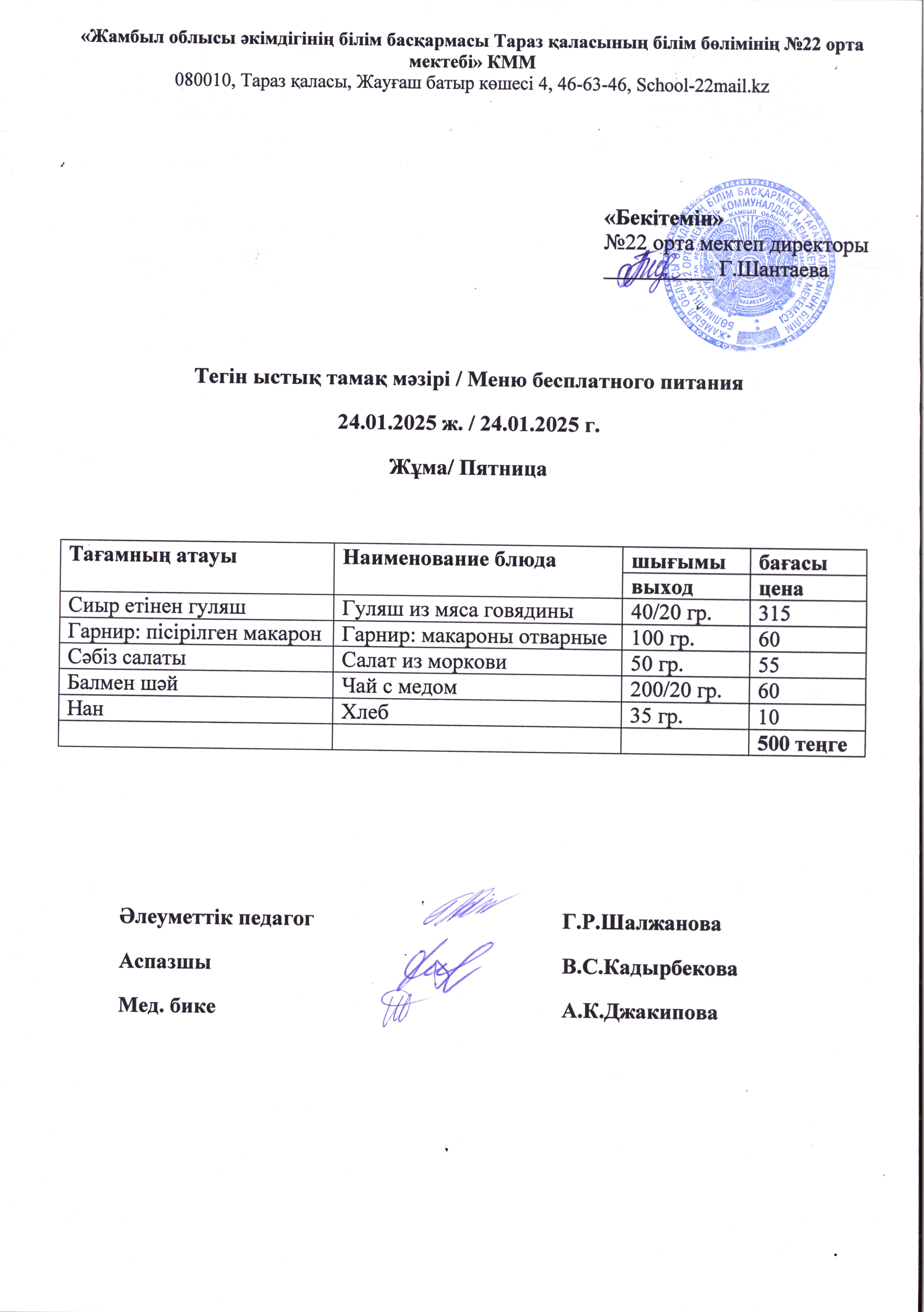 Тегін ыстық тамақ мәзірі / Меню бесплатного питания (27.01.25-31.01.25) » №22 орта мектеп