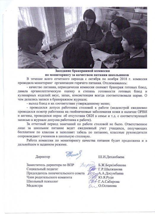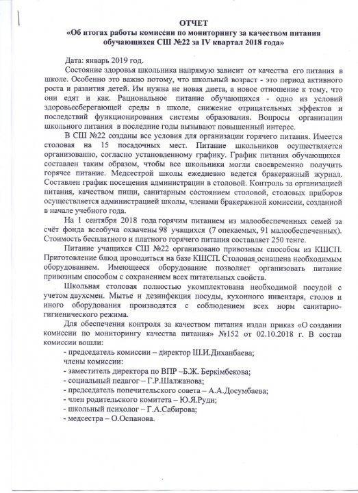 Отчет об итогах работы комиссии по мониторингу за качеством питания » №22 орта мектеп