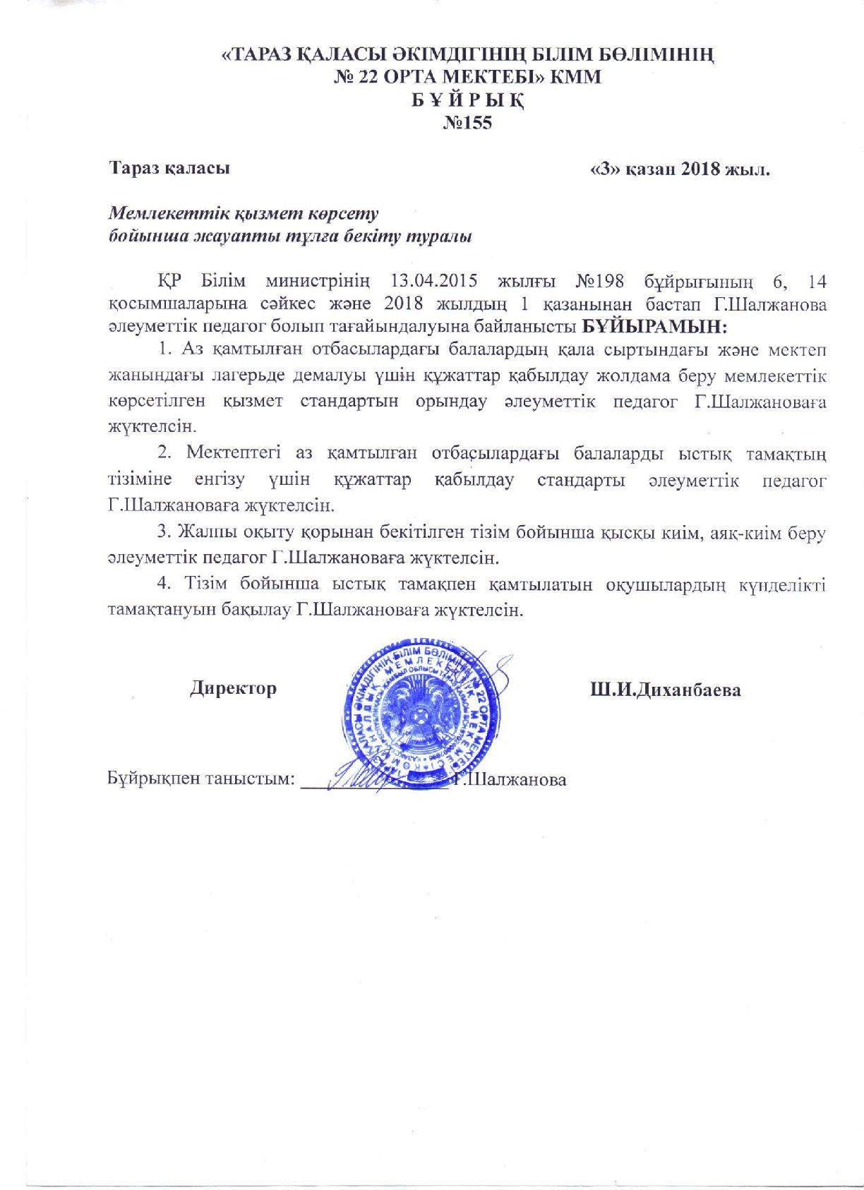 Мемлекеттік қызмет көрсету бойынша жауапты тұлғаны бекіту туралы » №22 орта мектеп