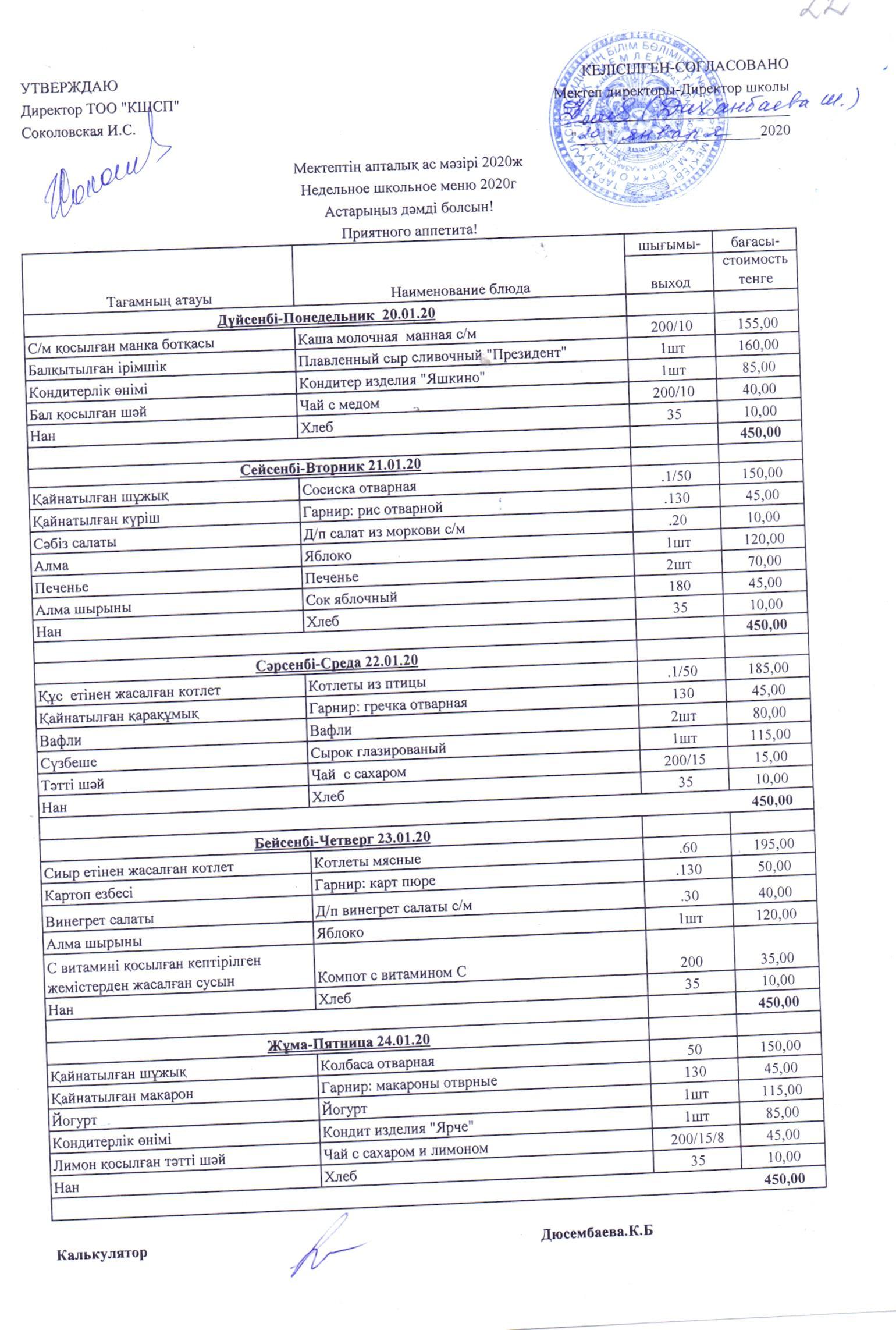 Меню с 20 по 24 января 2020 года » №22 орта мектеп