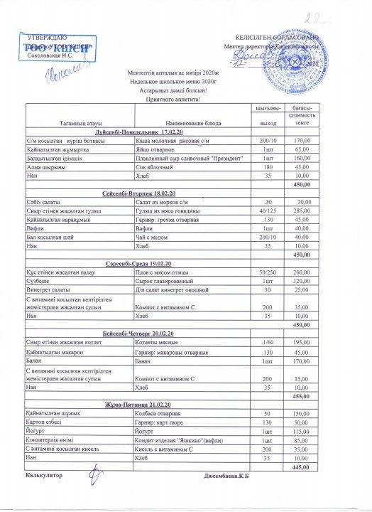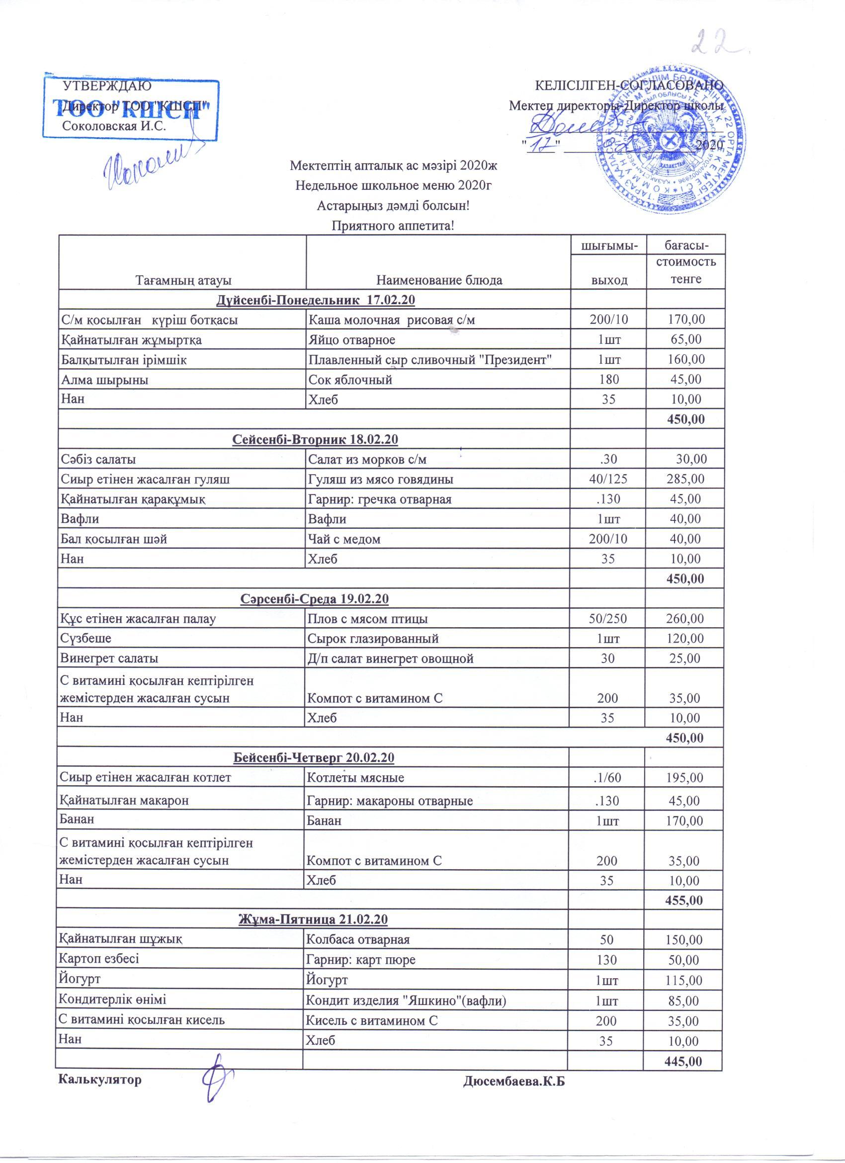 Меню с 17-21 февраля 2020 года » №22 орта мектеп