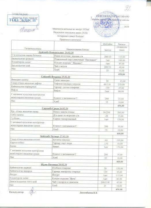 Меню с 24-28 февраля 2020 года » №22 орта мектеп