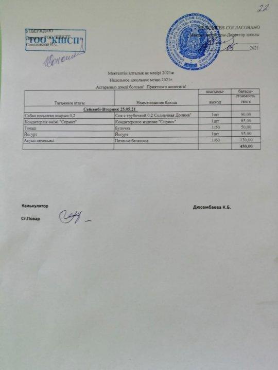 Меню горячего питания в буфете с 24 по 25 мая » №22 орта мектеп