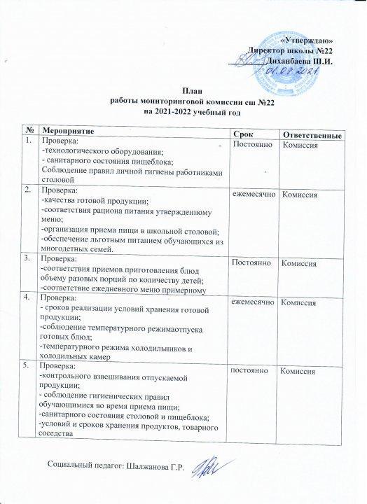 План мониторинговой комиссии на 2021-2022 учебный год » №22 орта мектеп