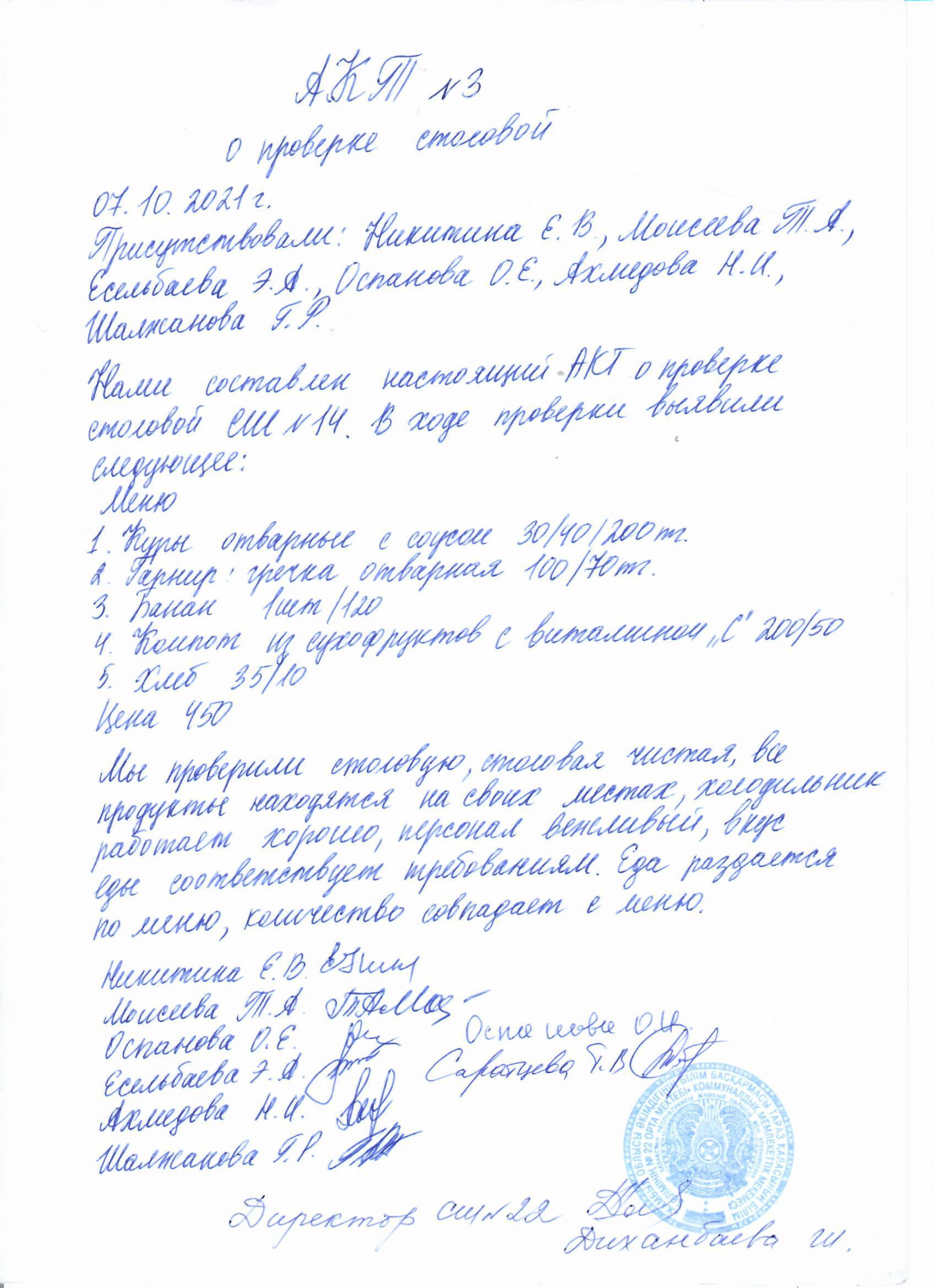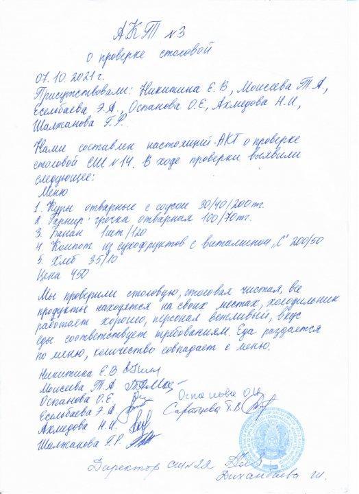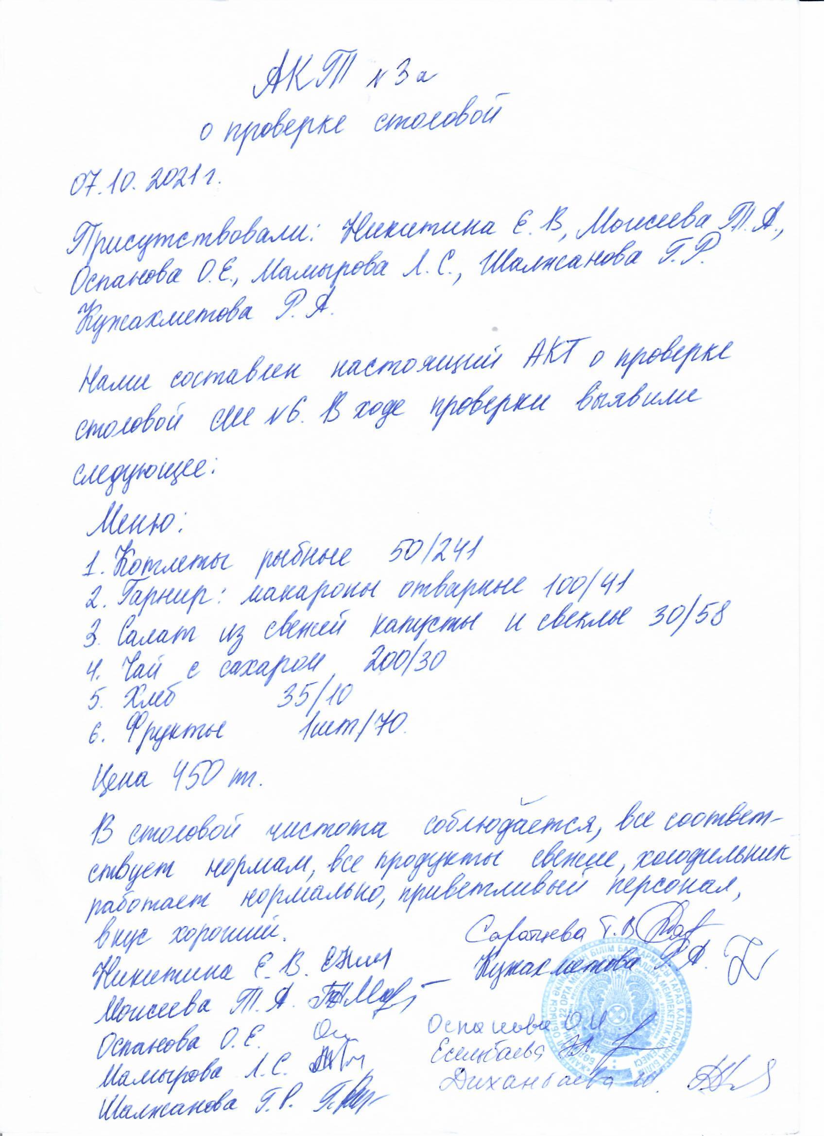 АКТ о проверке школьной столовой за 7 октября 2021 года » №22 орта мектеп