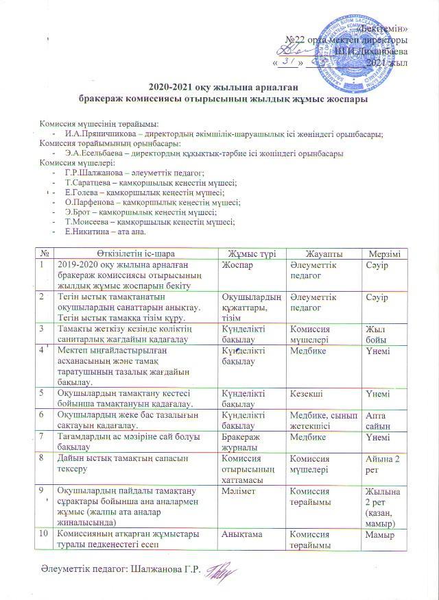 2021-2021 оқу жылына арналған бракераж комиссиясы отырысының жылдық жұмыс жоспары/План работы бракеражной комиссии на 2020-2021 учебный год » №22 орта мектеп