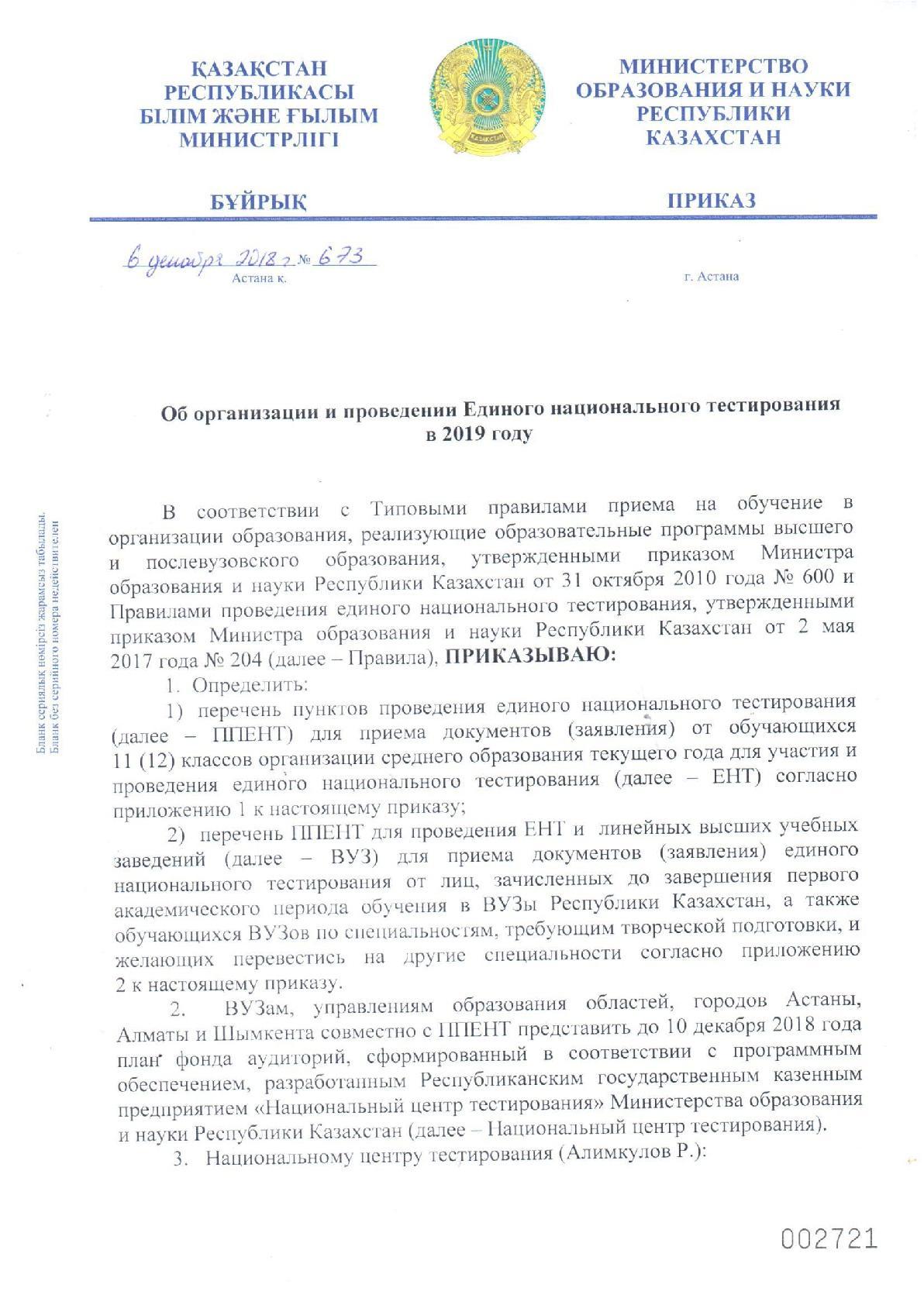 » » Приказ МОН РК от 06.12.2018 года за №673