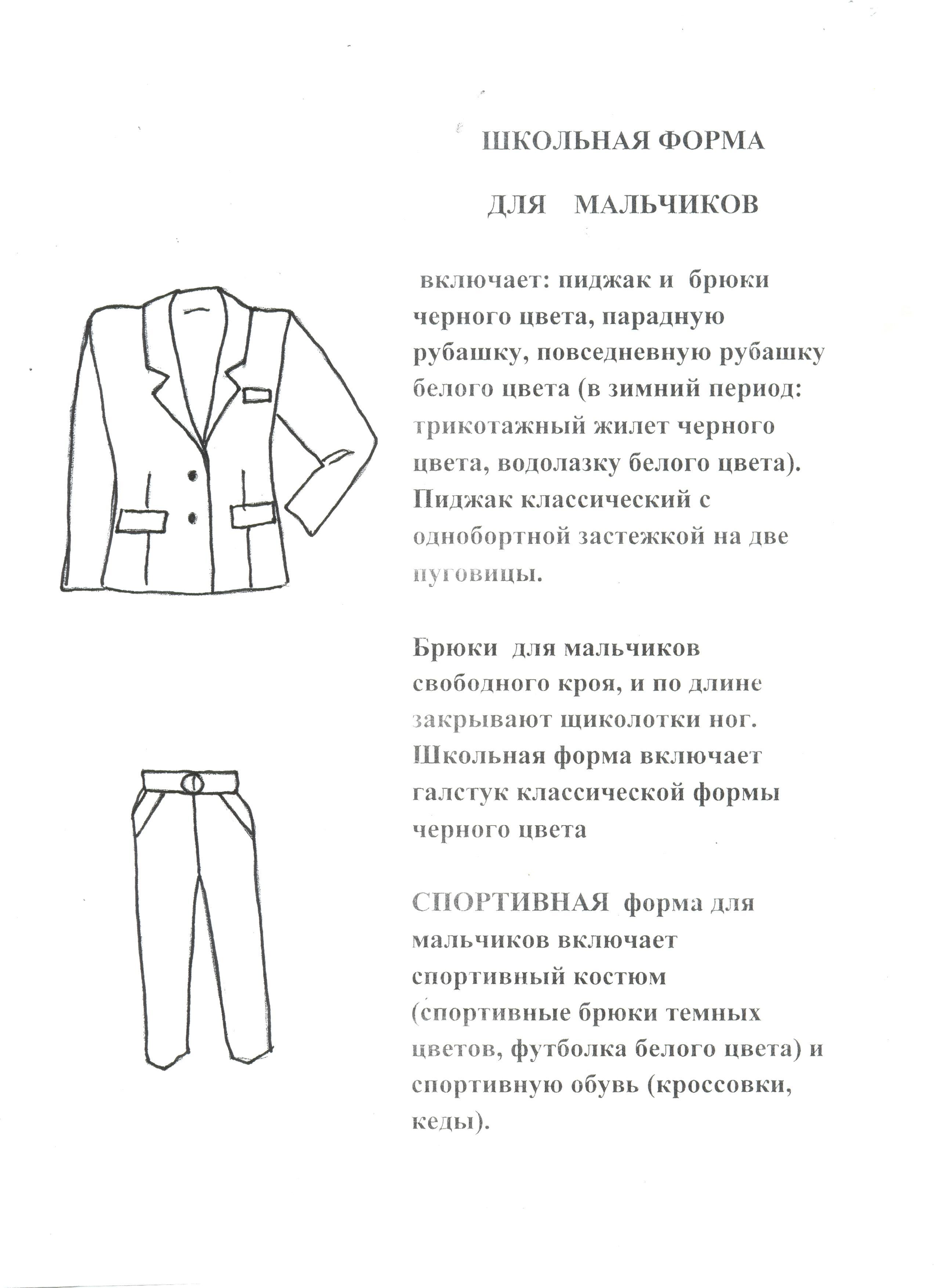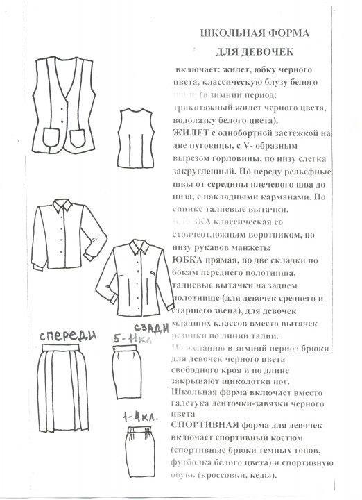 По школе выбрана и утверждена обязательная школьная форма (Протокол №3 Общешкольного родительского собрания от 16.04.016г.) согласно Приказа Министерства образования и науки Республики Казахстан №26 от 14.01.2016 "Об утверждении требований к обязательной школьной форме для организаций среднего образования",