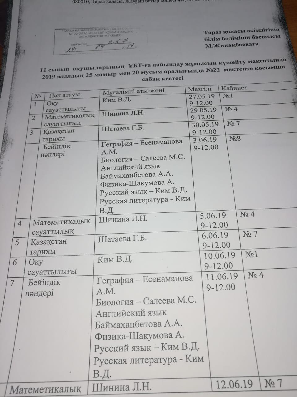 31 май 2019 0 1 2 3 4 5 подготовка к ЕНТ В средней школы №22 города Тараз активно идёт подготовка к ЕНТ. По утвержденному плану подготовки к ЕНТ с 27 мая по 20 июня будут вестись консультации по обязательным предметам и предметами по выбору.
